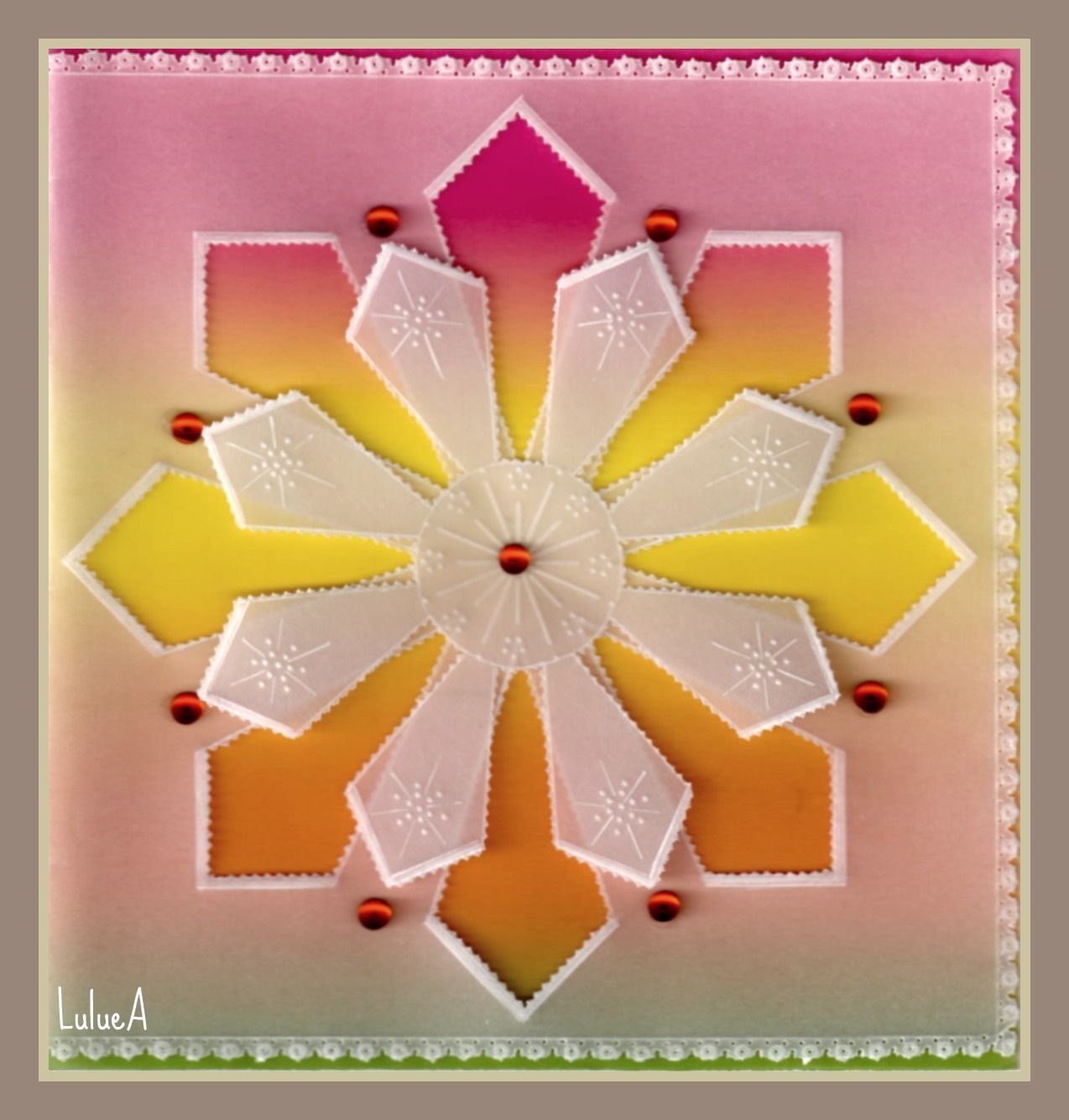 Un flocon tout découpé, ici le traçage a été le maître de ce modèle, contour de la carte, tous les cristaux sont tracés à la règle, chaque pointe est bordée d'un double trait. Le traçage à l'encre est toujours délicat même si j'utilise une règle anti-trace, les bavures ne sont hélàs pas exclues. Je suis assez contente car j'ai réussi l'ensemble des traits du premier coup. J'ai travaillé *doucement et sans précipation, enfin comme d'habitude. le fonds multicolore me fait penser à un coucher de soleil.